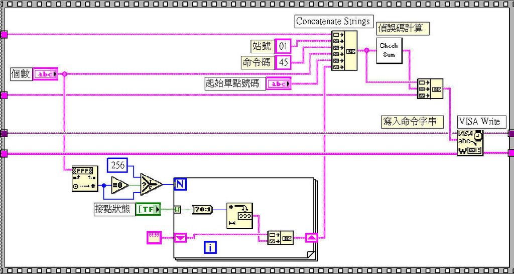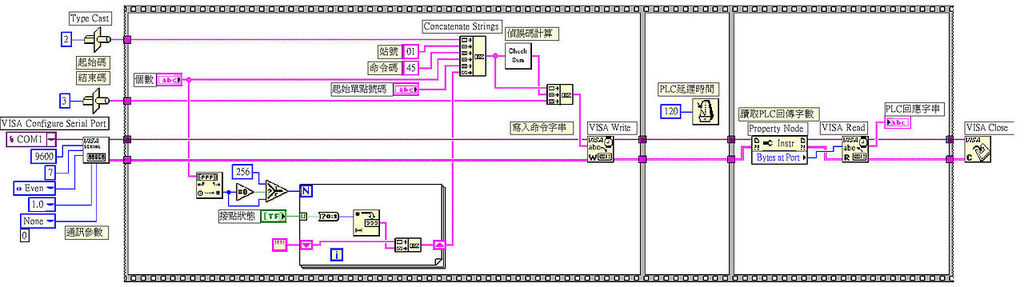 同樣是3格流程控制,起始碼、結束碼、通訊參數和關閉通訊埠等不能更改的部份一樣寫到格子外