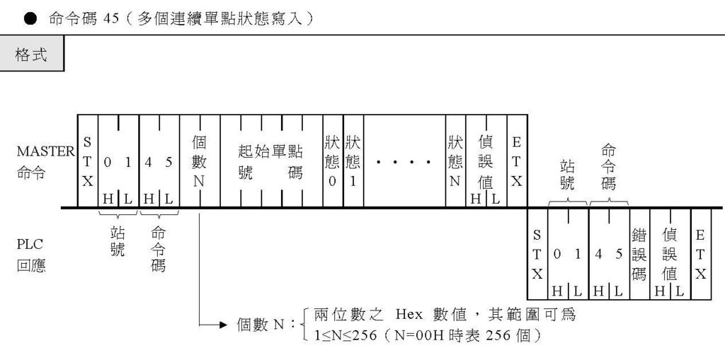 命令寫入字串的組成:起始碼+站號+命令碼+個數+起始單點號碼+連續單點狀態+偵誤碼+結束碼