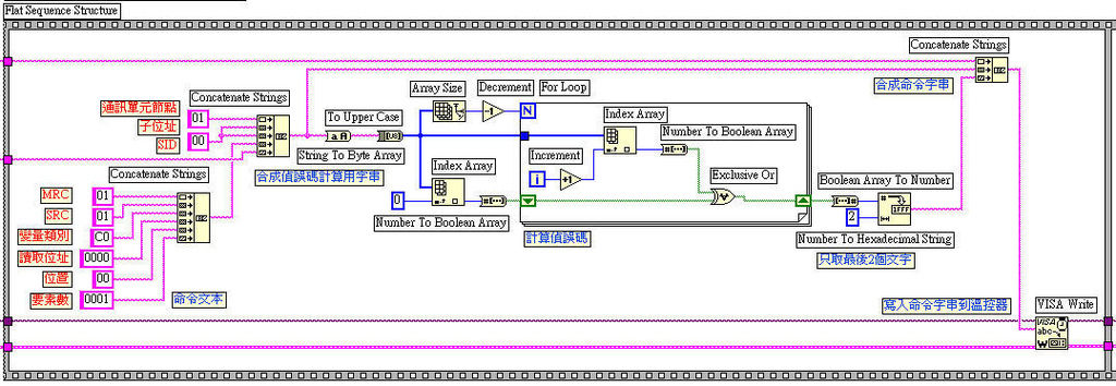 4.讀取溫控器回應字串:這裡可以直接使用VISA讀取元件,但我都先用其他元件先確認傳回多少字串再讀取,這樣可以確保程式不會讀取錯誤當機