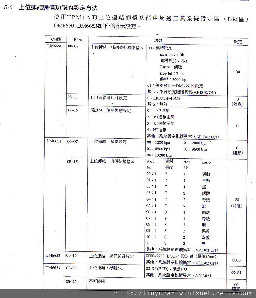 通道DM6650:設定通訊是使用內定值還是自訂值,注意之後通訊要用的是上位連結,所以這一通道的08~15位元是0不要更改,00~07位元若是使用內定值則設定為00,若是要使用自訂值則設定為01。也就是用內定值時設定成0000,用自定值時設定成0001