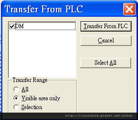 在設定畫面找到Transfer From PLC這個功能按鈕,點下去以讀取PLC目前內部設定值