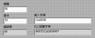 首先控制面板設置了機號、指令、寫入字串等3個字串輸入元件,還有偵誤碼、PLC回應字串等2個字串輸出元件。這樣的配置是為了以後可在其他程式使用