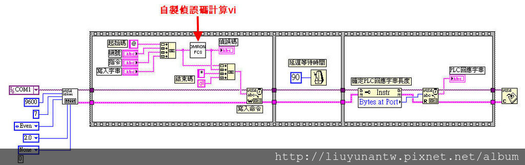 第3格一樣先用Property Node元件設定為Bytes at Port接收判定PLC回應字串長度。若硬體連接線5和9腳接錯則回應字串長度一定是0,若最前面通訊參數下錯回應字串長度也是0