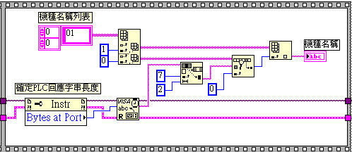 PLC回應的字串組成:起始碼+機號+指令+結束代碼+機種代碼+偵誤碼+結束碼。在這裡會讀到的字串是@00MM001140*(ASCII碼13)等13個字,這裡要做的是略過前面起始碼+機號+指令+結束代碼幾碼,直接擷取機種代碼那2個字,然後從機種名稱列表去找出機種型號顯示出來