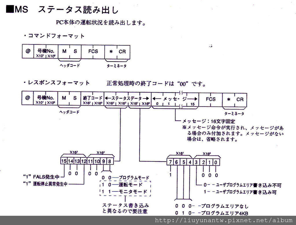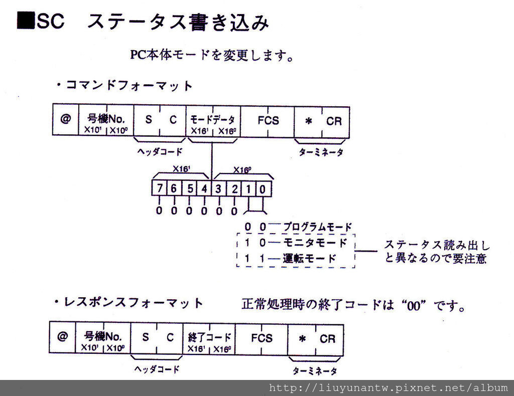 寫入字串才是這個指令的重點,手冊上是把2個16進制數值拆開成8個位元來說明,寫入命令時要轉換為16進制數值。PROGRAM(程式書寫模式)要寫入00、MONITOR(監看模式)要寫入02、RUN(運轉模式)要寫入03