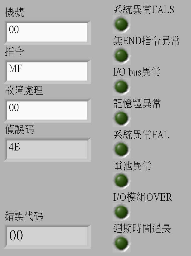 PLC回應的字串組成:起始碼+機號+指令+結束字串+故障代碼1+故障代碼2+偵誤碼+結束碼