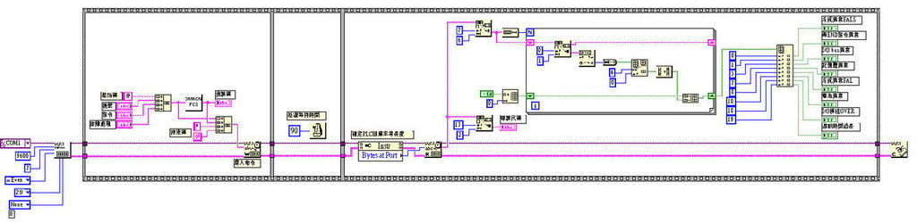 同樣是用Flat Sequence Structure元件做3格控制動作流程,通訊參數及關閉通訊埠寫到格子外