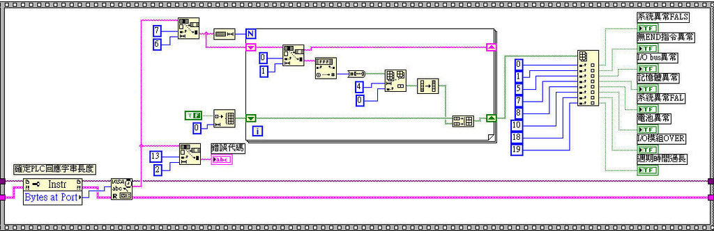 其次取出故障代碼前6個字串,用For Loop把每個字分離,分離的字再轉成數值,最後用Number To Boolean Array元件轉換成Boolean狀態。轉換後的Boolean狀態只取前4個,反轉後再依序重組成單一陣列。對照手冊取出陣列中有效位址,連接到對應的顯示LED燈號上