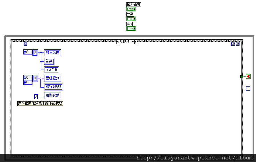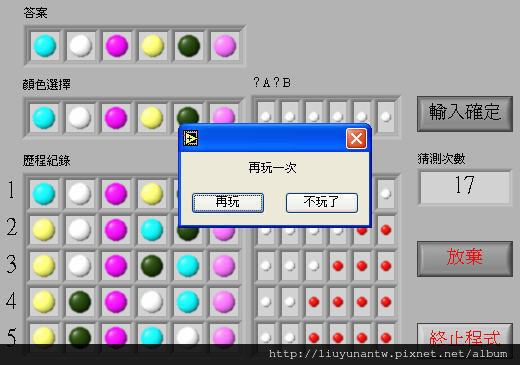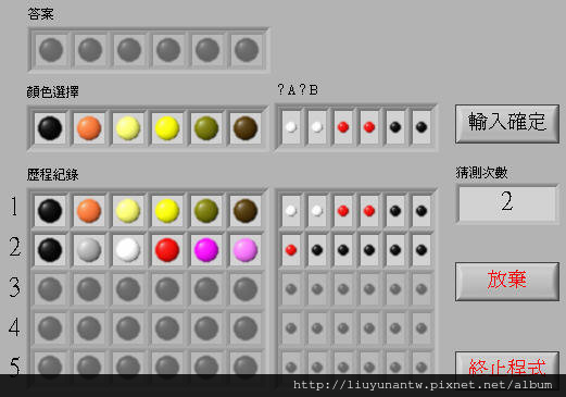 用LabVIEW來寫一個小遊戲,遊戲的原型源自一個"猜數字"的遊戲,但整個遊戲畫面都由數字組成也很無趣,所以改造成"猜色球"的遊戲
