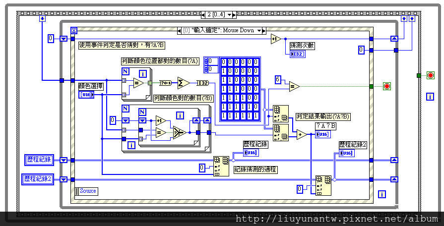 再來為避免浪費電腦系統資源,使用Event Structure元件以事件觸發方式動作。輸入的色球在此是以數值輸出,輸出的數值和謎底的數值比對。比對分成兩部份,一部份判定顏色及位置是否猜對,另一部份只判定顏色是否猜對,最後將兩部份重合輸出結果