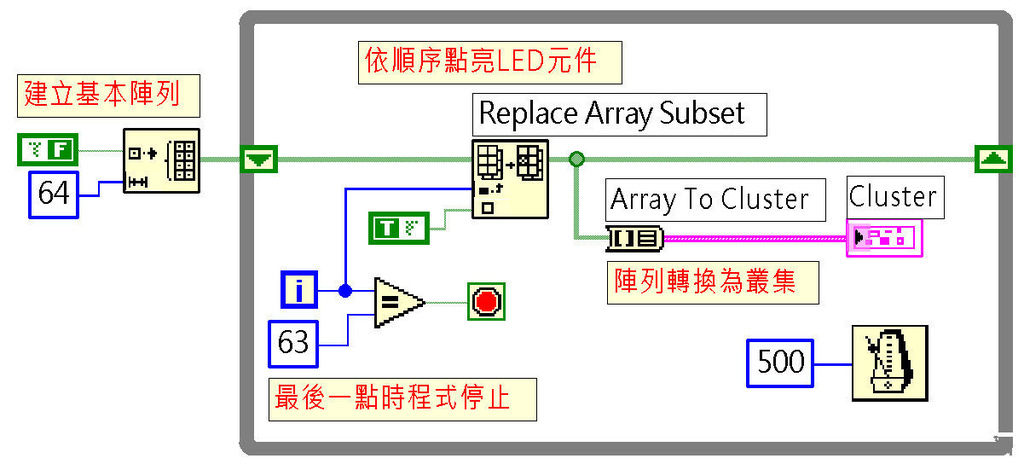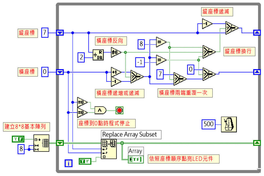 因為考慮到這個程式以後可能會實際用到機器上,所以是用While Loop迴圈來做,這樣在機器故障時才有可能緊急停止程式