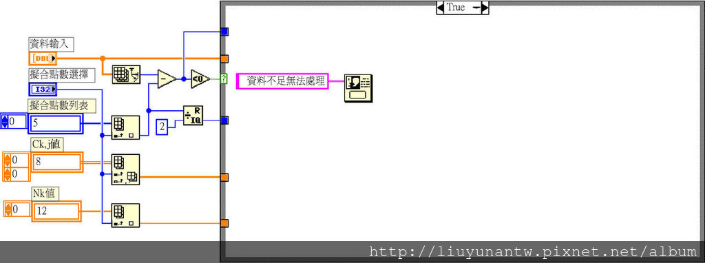 1.最外圍用Case Structure元件來判定資料輸入數量是否正確,錯誤則切換到錯誤訊息程式,並顯示資料不足無法處理的對話方塊。正確則執行資料擬合計算