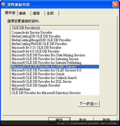 在資料連結內容視窗的提供者那一頁沒有MySQL ODBC 5.1 Driver這一項,所以這邊要選擇Microsoft OLE DB Provider for ODBC Drivers這一項,點選下一步