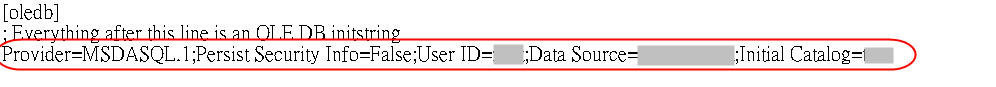 再來以記事本打開副檔名為.udl的檔案,Provider那一列字串就是在LabVIEW連線時要用到的內容