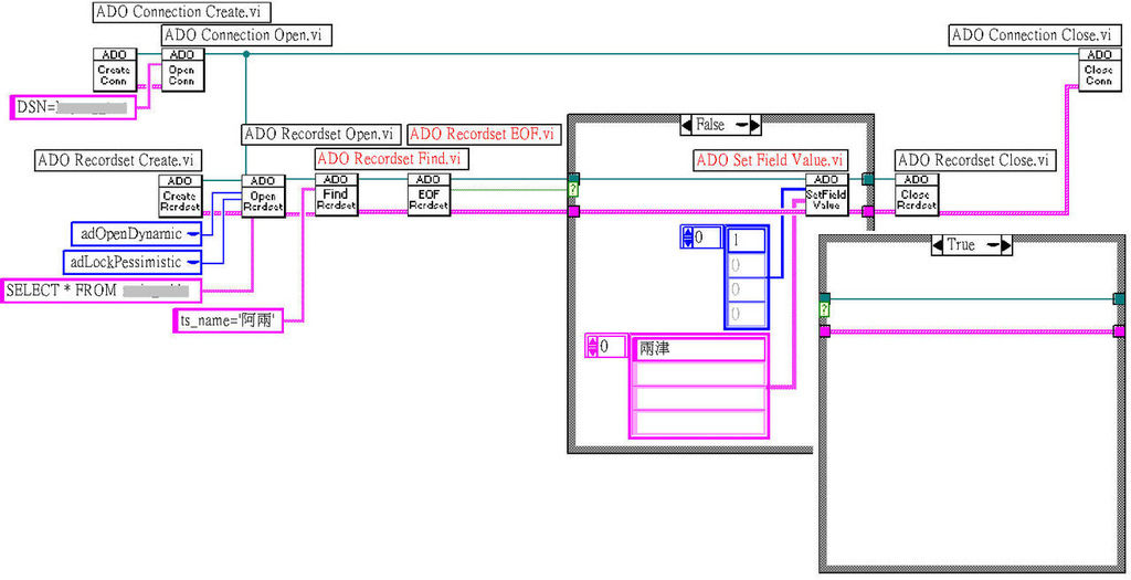 例如我只要修改欄位ts_name名稱裡有"阿兩"的那一筆資料中的ts_name這一欄,那在ADO Recordset Move.vi那邊要設定為1(索引編號)