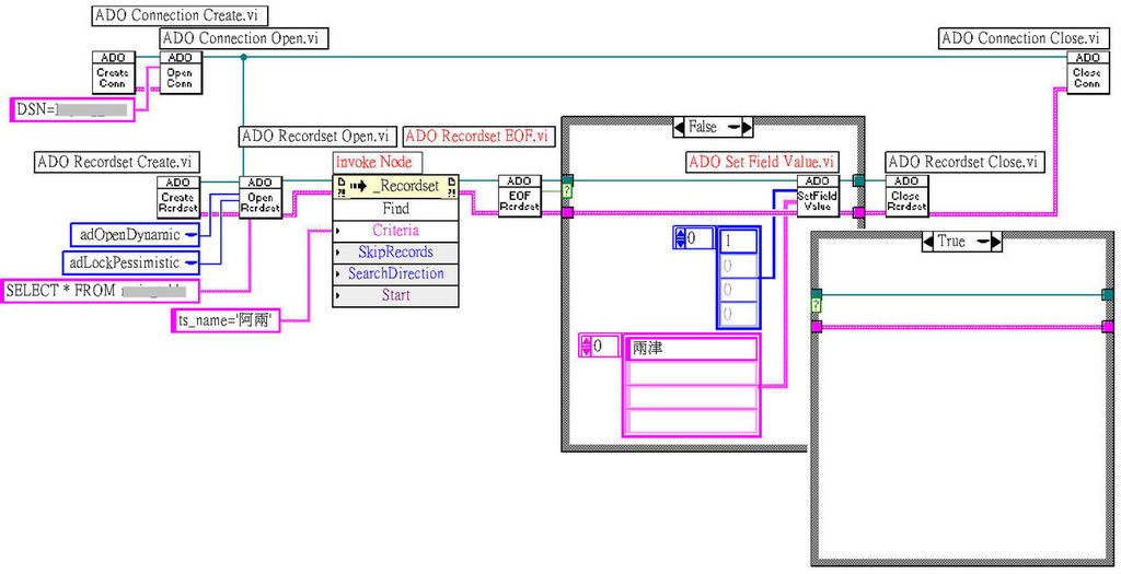 同樣是以ADO Recordset Find.vi或Invoke Node元件先搜尋到指定資料,再以ADO Set Field Value.vi修改
