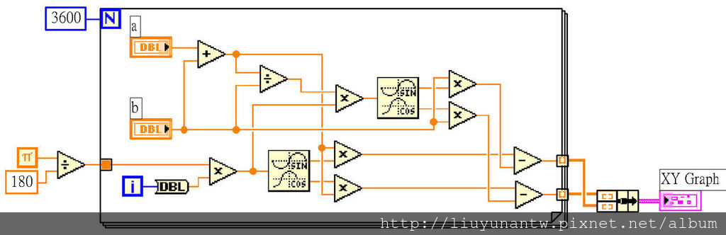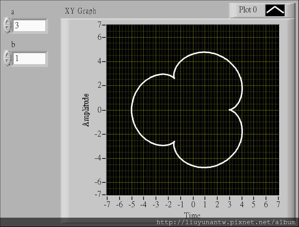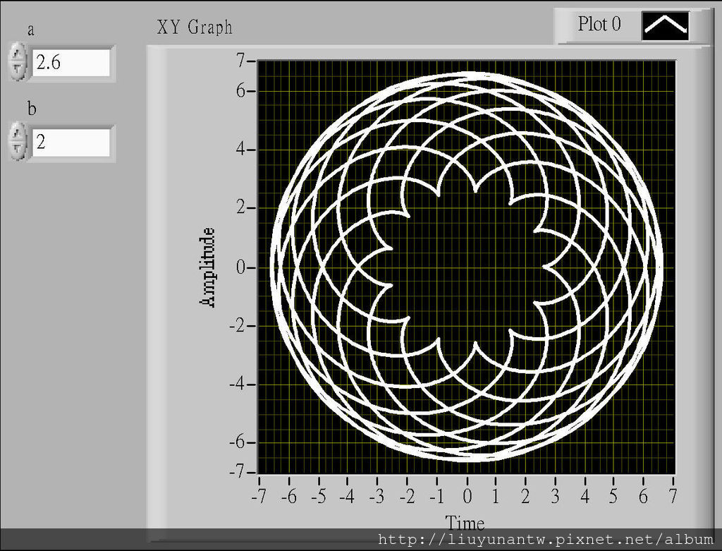 第2種epicycloid(外擺線)函數有a、b和t這3個變數,同樣a、b若設定為帶有小數點的非整數,則For Loop迴圈執行次數必需調整增加才能畫出完整圖形