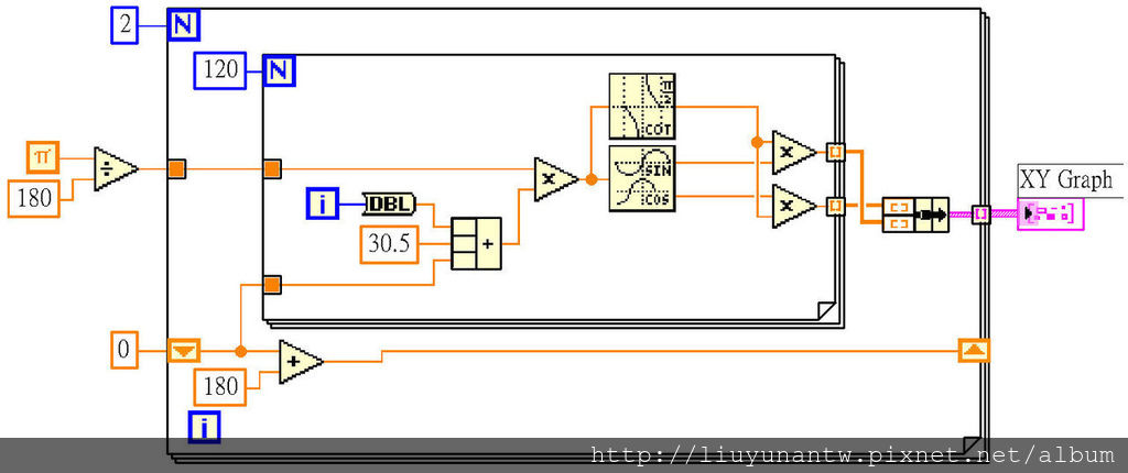 這個函數照正常會自動產生斷點,然後畫出左右2個圖型。但因為XY Graph元件的特性會自動把斷點連接,以至於畫面上多出不屬於函數內的線條,所以把程式切成2段來避開斷點連接的問題。後續文章提到有類似問題的函數會同樣處理