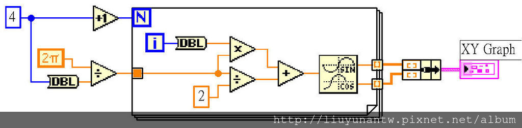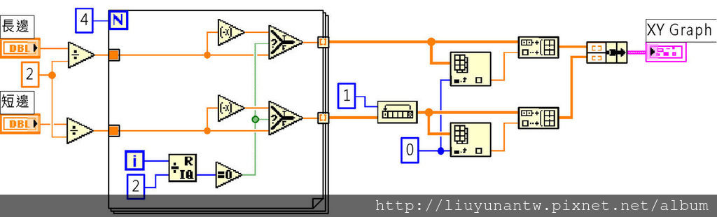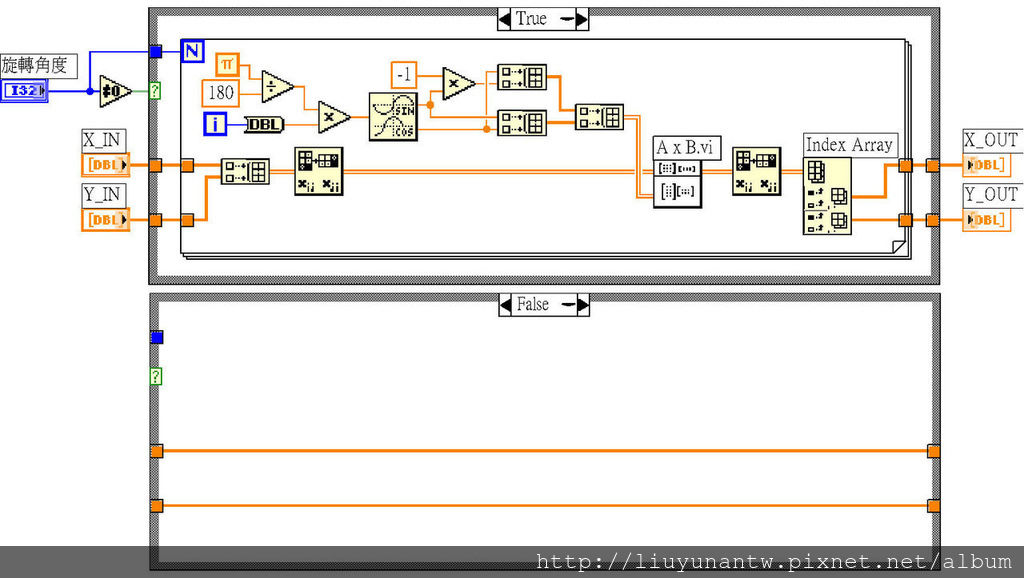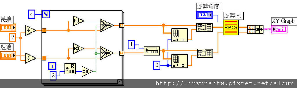 圖形的旋轉可在圖畫好後在以公式算出旋轉後的座標點,關於旋轉圖形的公式,之前的文章有提到。把那個公式寫成SubVI