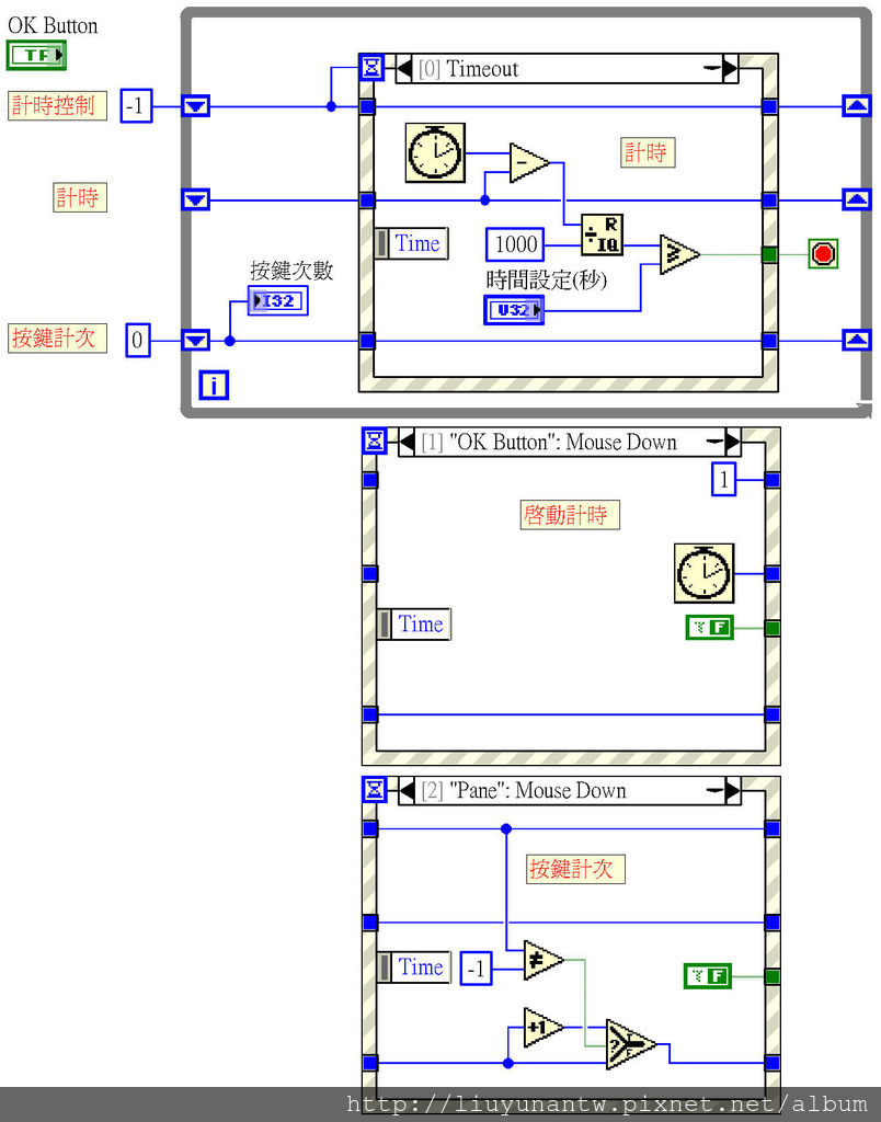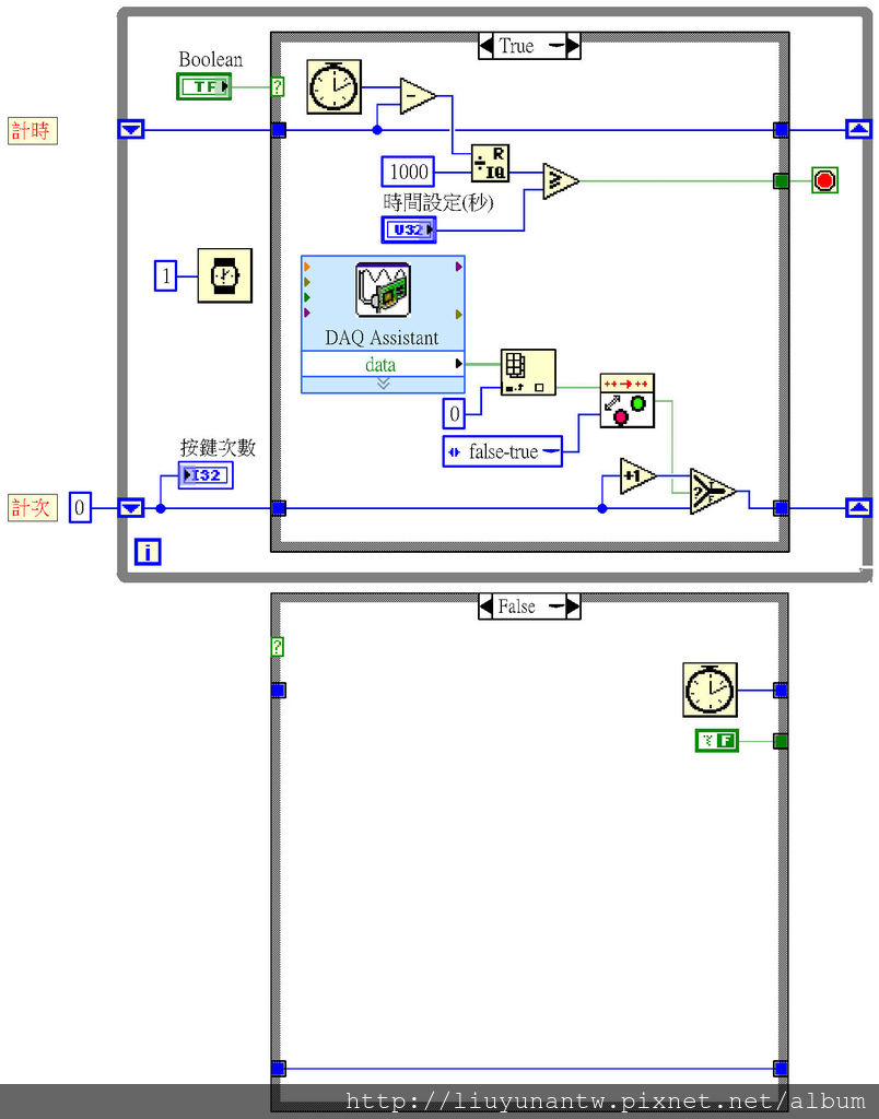 程式用DAQ小幫手就可以輕鬆完成,擷取到的訊號透過Boolean Crossing PtByPt 篩選,確保只有在按鈕按下的第1次時才計數,不會因為按著不放就連續計數
