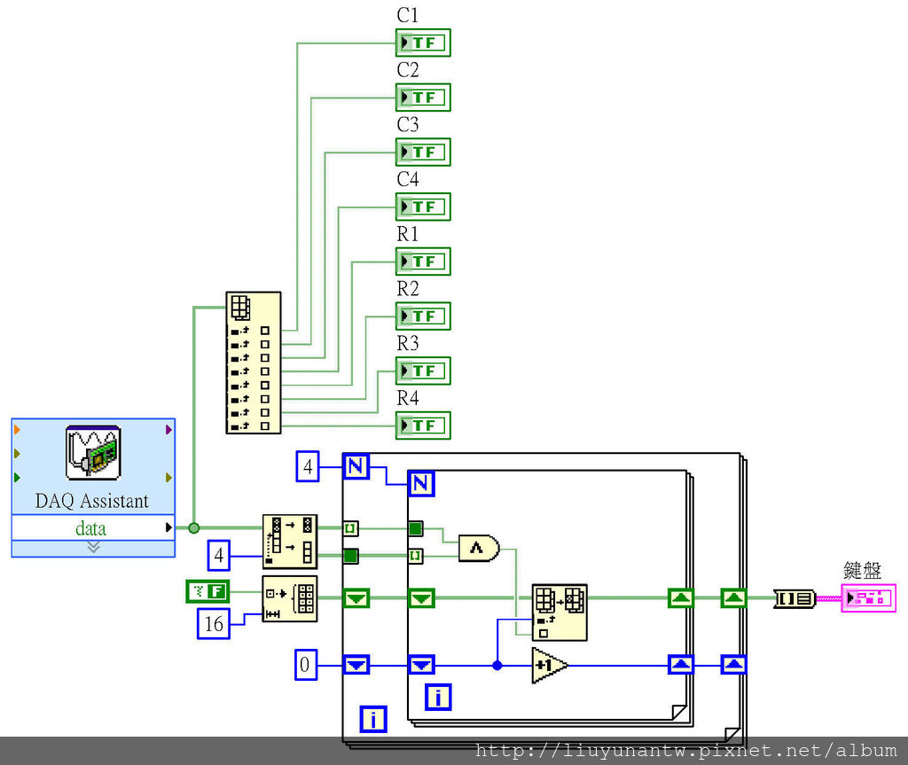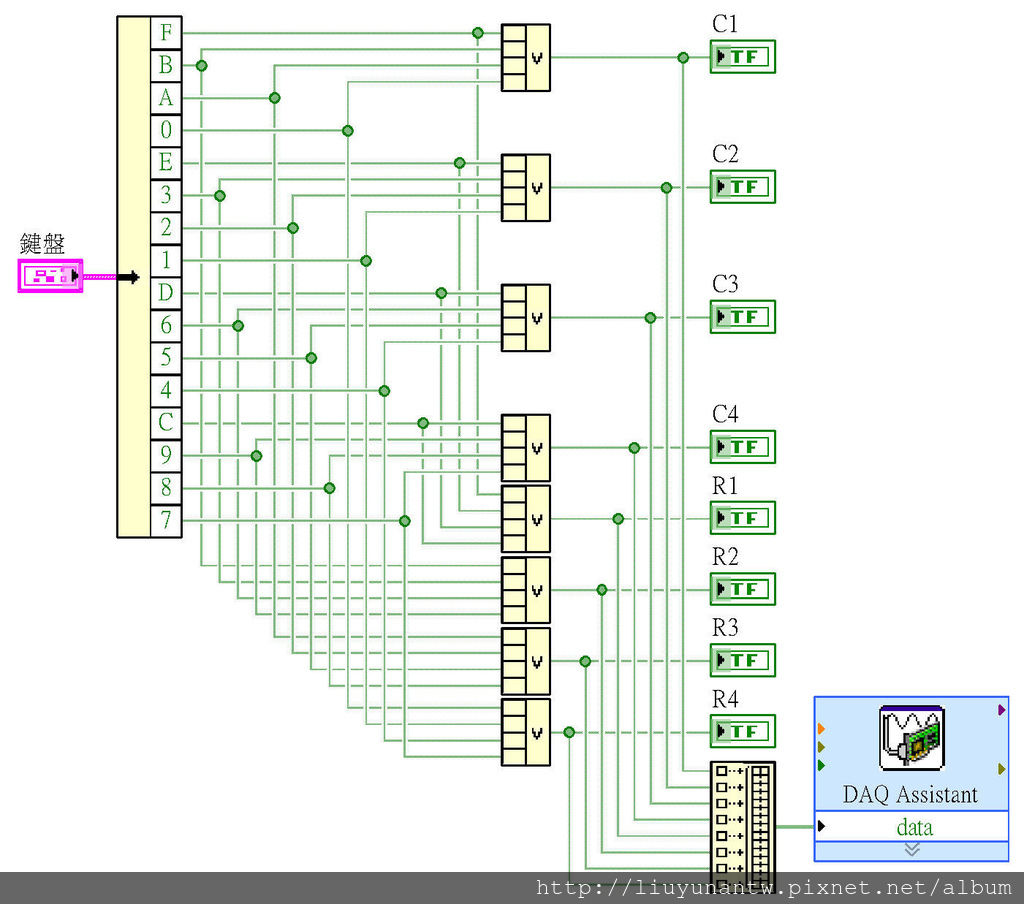程式同樣使用USB 6501的P0通道來接收矩陣鍵盤的8個接點訊號,再把8個接點分成兩半,用雙迴圈交叉比對還原成對應的按鍵