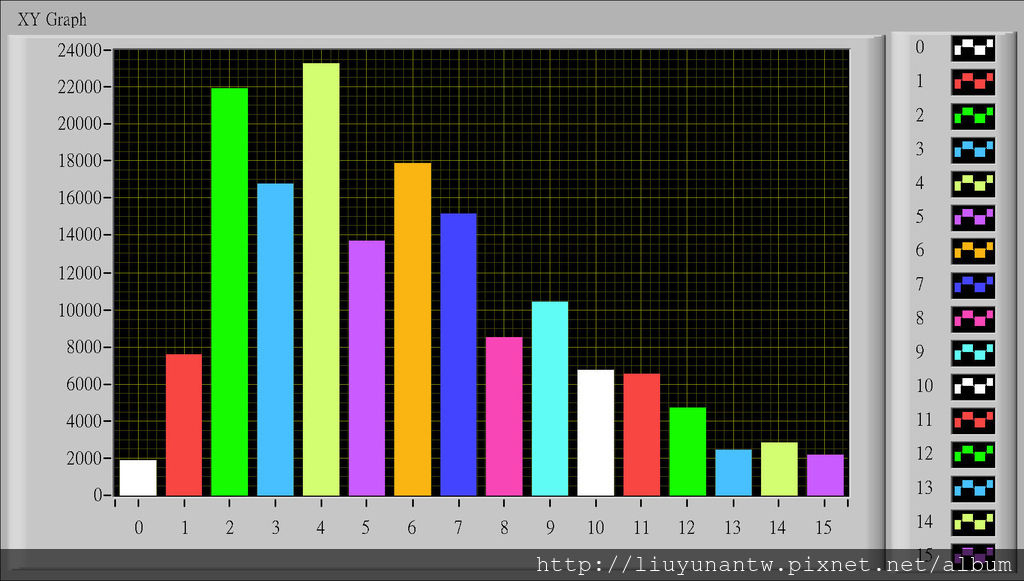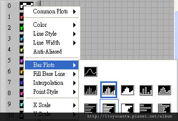 如果只是顯示直條圖只要修改Graph顯示元件的設定資料連進去即可,要每筆資料用不同顏色顯示就有點難度,因為顯示元件的Plot只能設定一種顏色,要多種顏色就需要多個Plot顯示