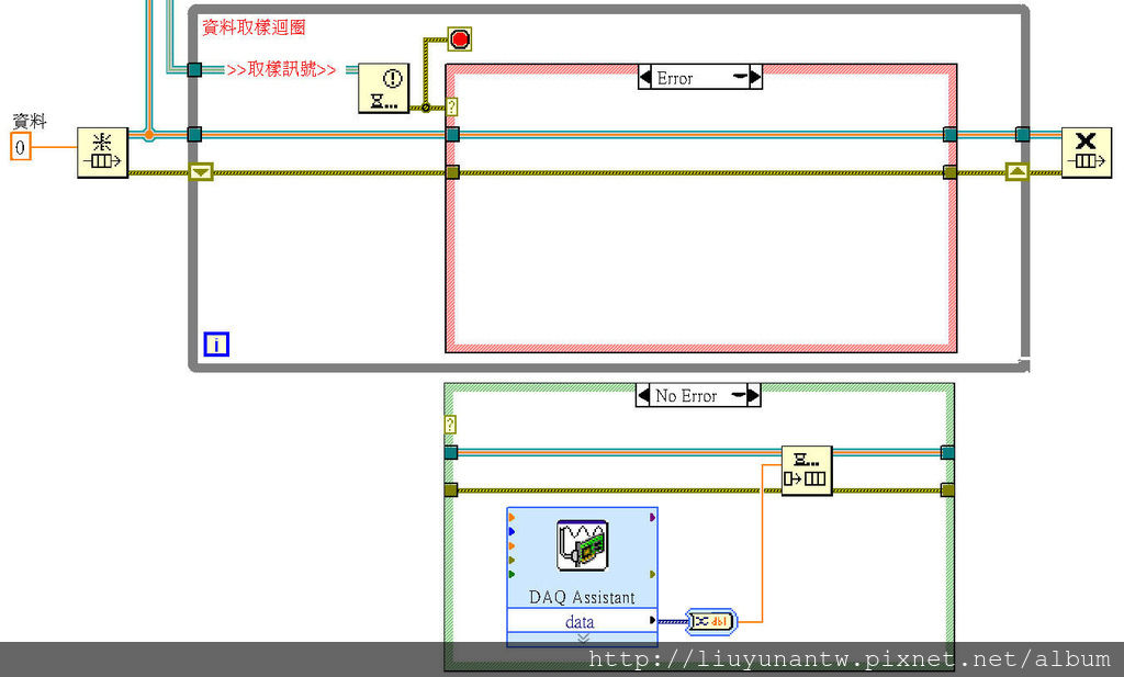 程式最下方資料取樣迴圈:設定上接收主架構迴圈的訊號動作,主架構迴圈沒有訊號時不會動作,有訊號時會先判斷有沒有錯誤?有錯誤則停止從架構迴圈,沒有則繼續執行後續程式