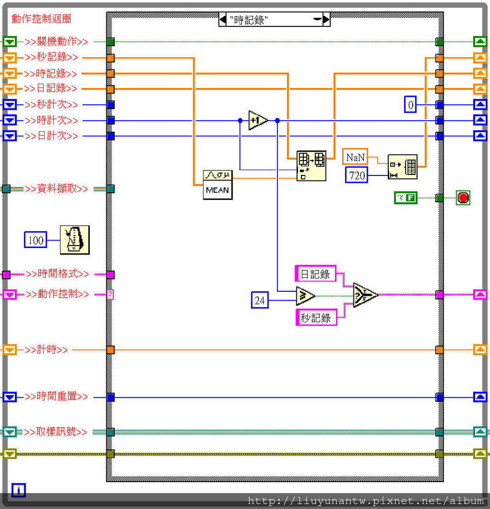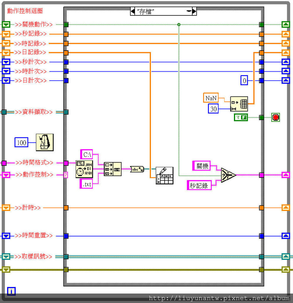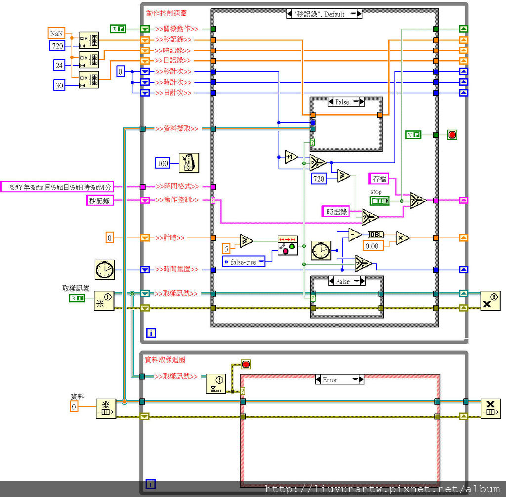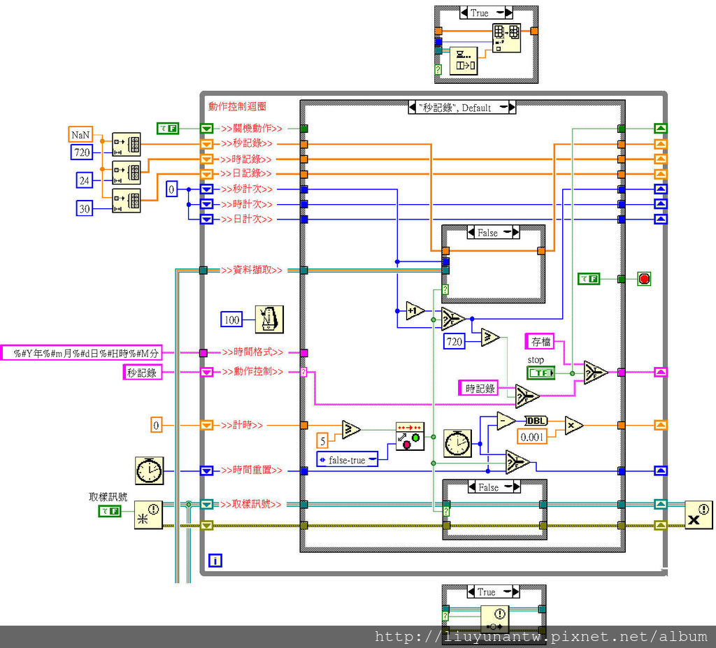 中間:時間控制程式和動作控制程式的初始值,動作控制是用狀態字串加上移位暫存器加上Case元件來達成;自動存檔部分使用系統時間格式化成年月日時分的字串輸出為檔名
