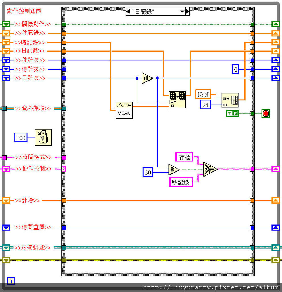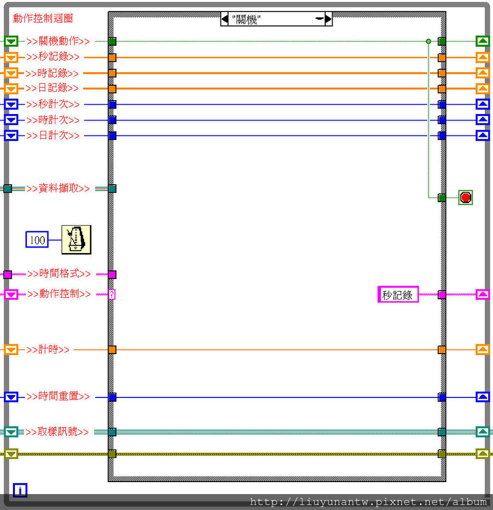 最下面:設定主架構送出的控制訊號類型為布林狀態,當上面的動作控制迴圈有送出訊號時,底下資料取樣迴圈才會動作,並在動作完畢後自動待機