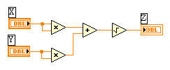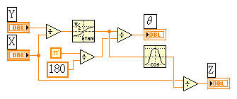 ※LabVIEW的角度計算較麻煩,程式裡面相關計算元件全以"徑度"計算,而非常用的公制角度。所以在計算元件前或後都必須再乘或除以(π/180),把徑度和公制角度互相轉換