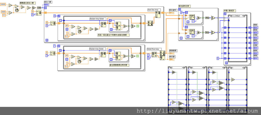 產生簽注人數→產生簽注號碼資料→產生開獎號碼→比對簽注號碼資料→統計各獎項中獎人數