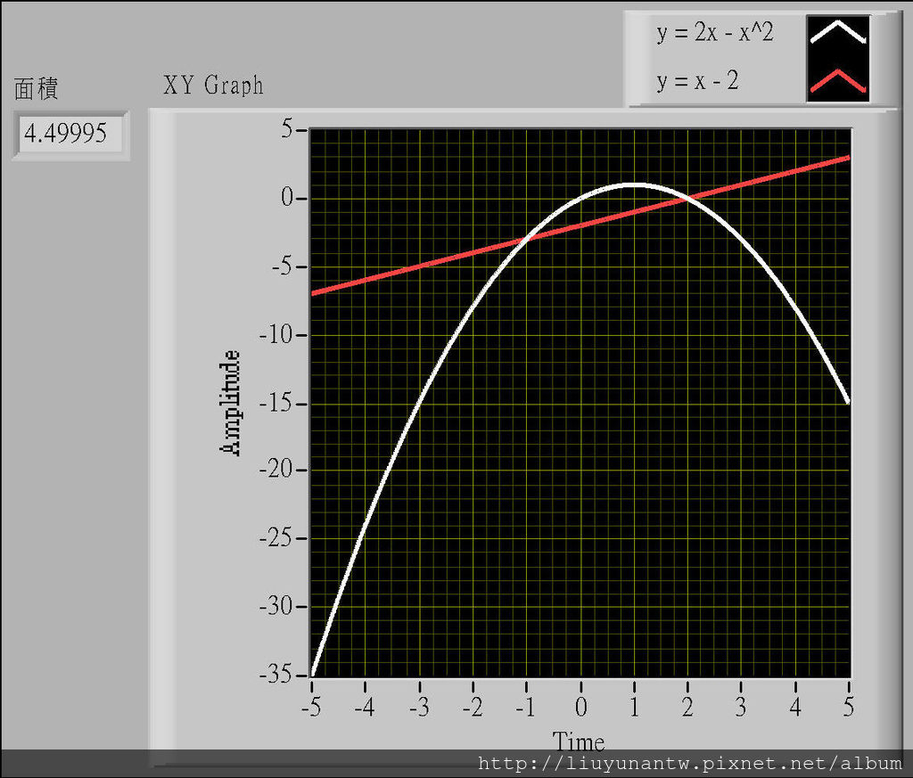 問題:試利用圖表或圖形顯示,曲線y=2x-x平方 與 y=x-2 所圍成的面積為多少?