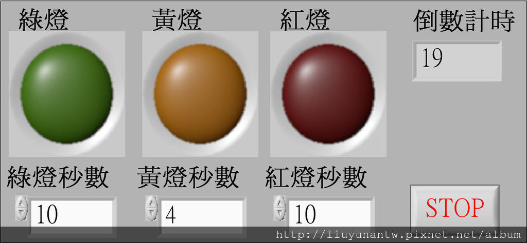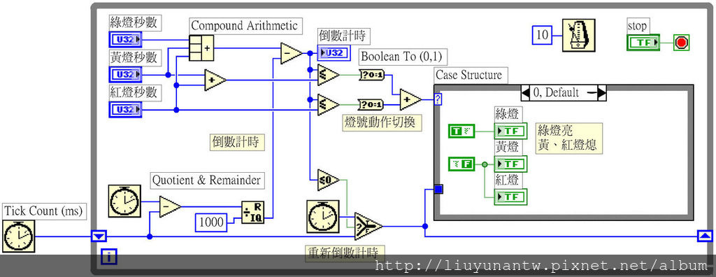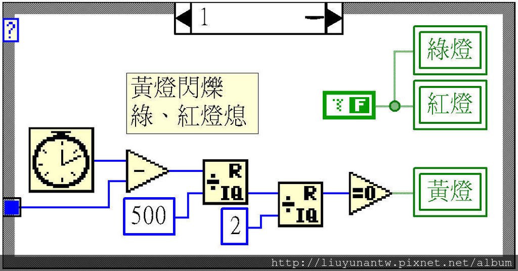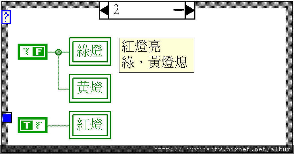 燈號的切換使用Case Structure元件,Case Structure元件做出3個頁面,頁面0,Default控制綠燈,頁面1控制黃燈,頁面2控制紅燈