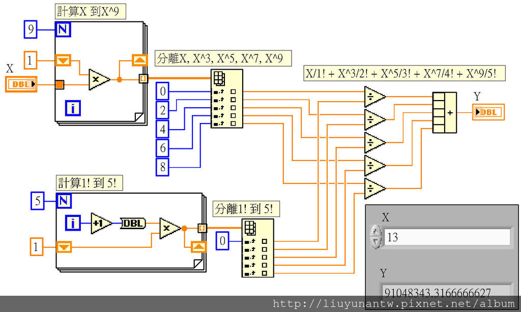 題目:以迴圈方式計算 X/1! + X^3/2! + X^5/3! + X^7/4! + X^9/5! 之值