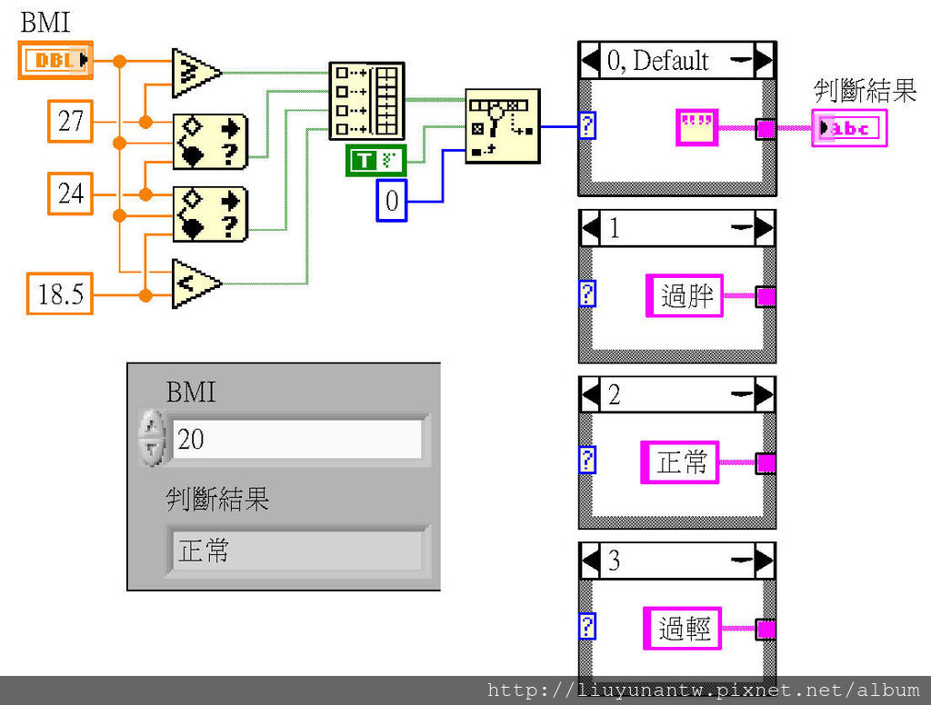題目:以LabView設計一BMI值檢測程式,並判斷“過重、適中和過輕”。(過輕 :BMI < 18.5 正常 :18.5<=BMI<24 過胖 : 24<=BMI<27)