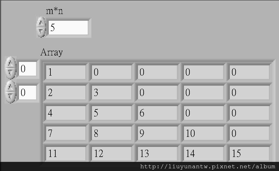 1.數值字陣列大小為m*n的2維陣列,且m=n。所以先用Initialize Array元件建立一個m*n大小的陣列,且預設值全為0