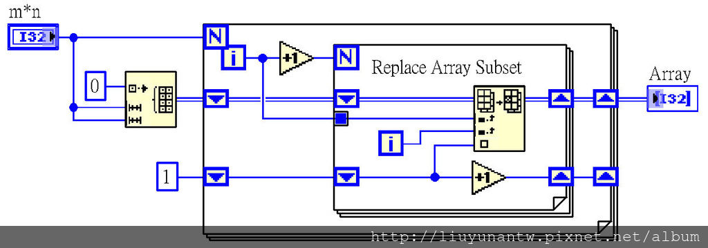 2.使用移位暫存器搭配Replace Array Subset元件把數值寫入正確位置,寫入數值同樣由移位暫存器自動累計