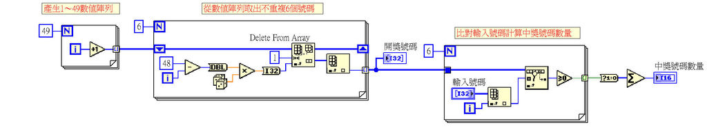 2.中獎號碼的比對也是用迴圈處理,將自行輸入的6個號碼和開獎號碼一一比對,最後再計算有幾個號碼中獎