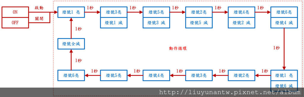你的問題經過整理後,大概就像以下的流程圖。算是跑馬燈的變形,用跑馬燈的程式寫法處理即可,不用想的太複雜。另外我在你的動作流程再追加一個可以停止全部程式的開關