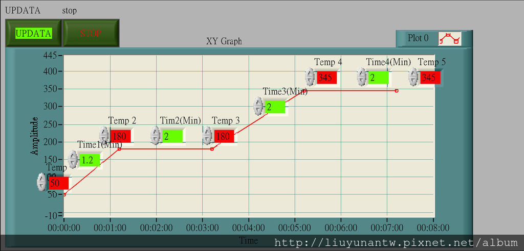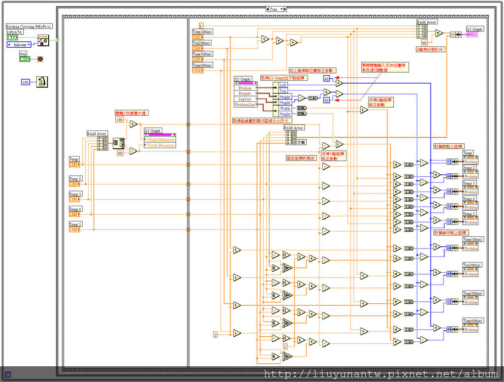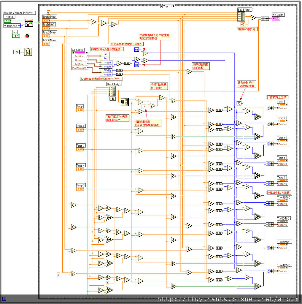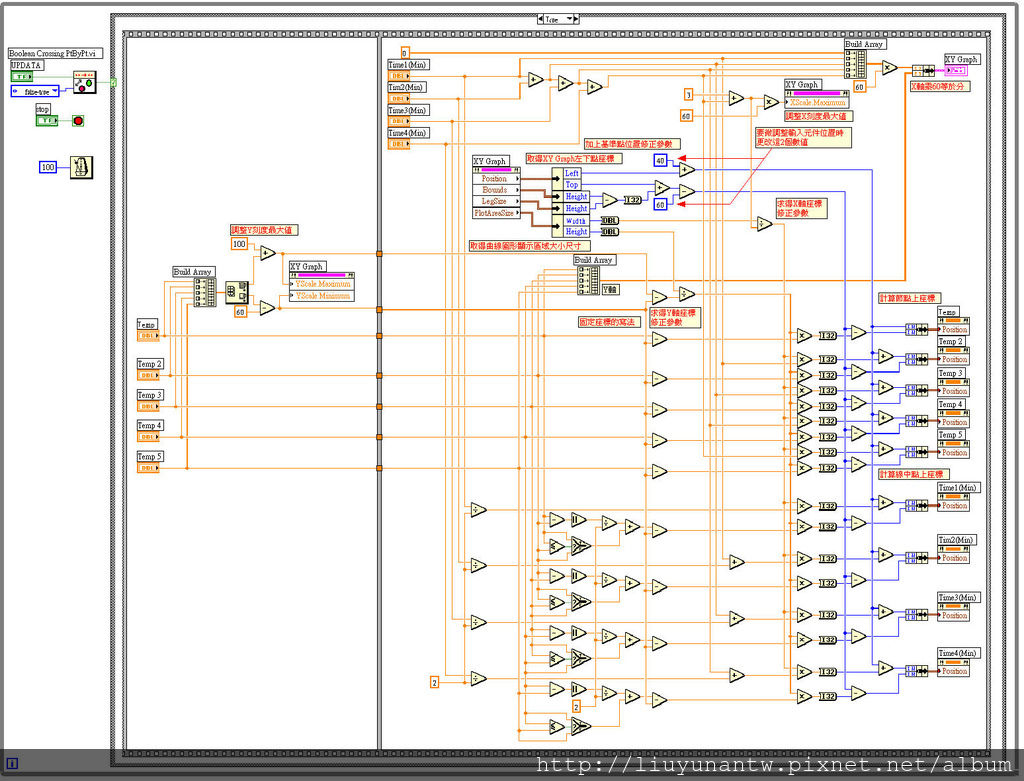 似乎沒有能直接取得Waveform Graph曲線圖形上每個點座標的方法,只好借用xy graph圖形的座標屬性來計算每個輸入元件的相對座標,輸入元件位置可能還不是很準,需依用途再調整看看