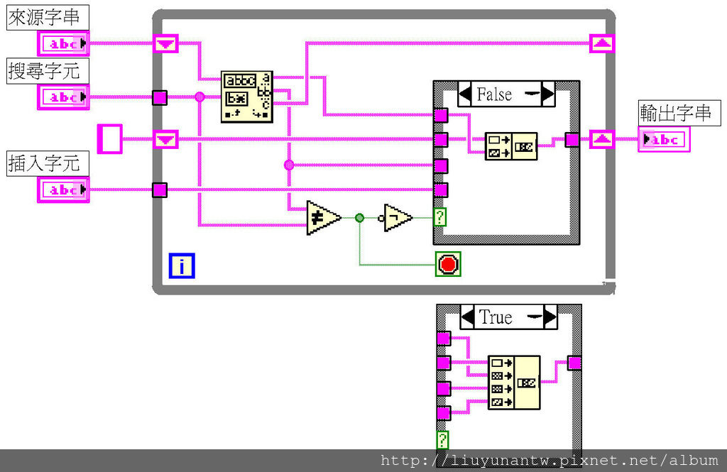 這個問題用文字工具裏面的Match Pattern元件就可以處理,因為指定的字可能有許多個,所以必需搭配迴圈和移位暫存器從頭搜尋整個字串,搜尋完畢後才結束迴圈輸出字串