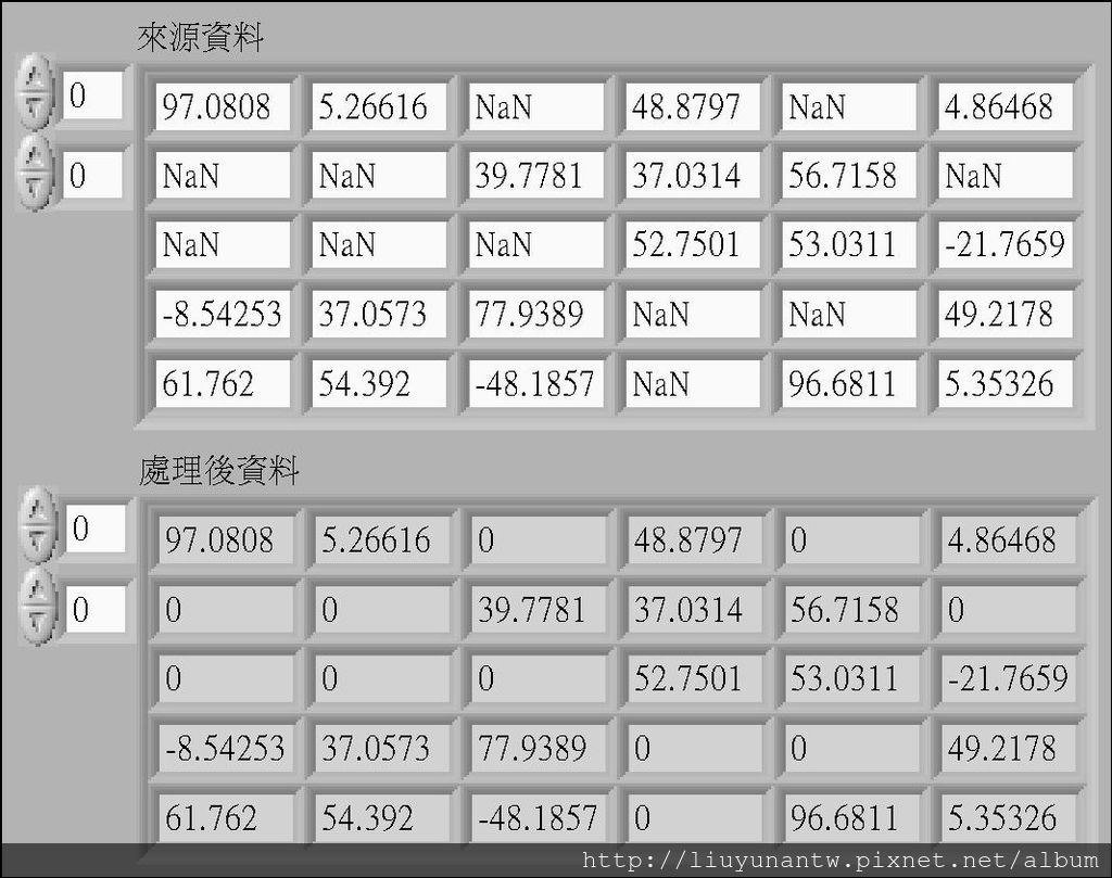 關於這個問題:NaN經測試比較或計算都會得到NaN的結果,反過來想比較或計算會得到結果的就不是NaN,所以我把二維陣列資料和一個數值0比較,得不到結果的就直接以0取代