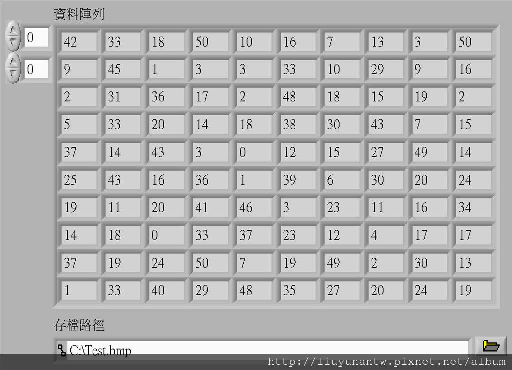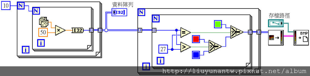 問題:有一個n*n的二維陣列,陣列中的數值為0~50。要將大於27的數值轉為紅色,小於27的數值轉為藍色,等於27的數值轉為綠色,然後將結果存成BMP圖檔
