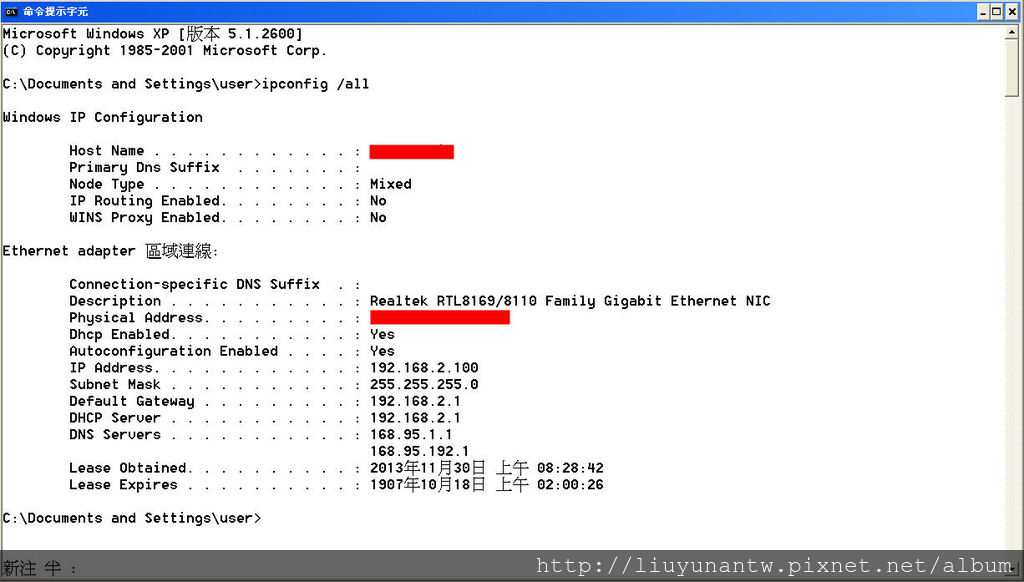 在命令提示字元執行ipconfig /all命令可以查詢網路組態,Physical Address字串後面是網路卡序號