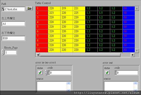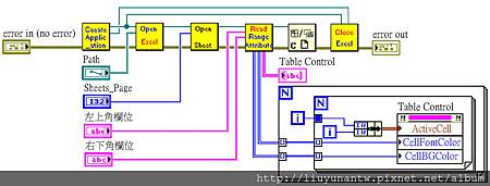 以下範例程式要讀取"指定路徑沒有檔案時自動新增Excel檔案及改變儲存格屬性"那篇文章程式建立的Excel檔案資料,同時讀取儲存格的文字顏色及背景顏色,在LabVIEW的Table顯示的顏色結果和Excel檔案相同