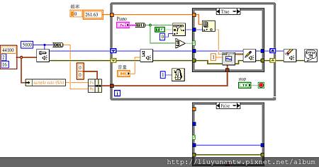 程式的部分比較簡單,發音使用正弦波輸出,只要注意實際控制發音的程式一定要在迴圈內即可。若音量不需在程式執行中調整,也可以把那段程式放到迴圈外。另外迴圈控制時間設定的Wait Until Next ms Multiple元件時間不要設定太長,否則按鍵按住不放時,發出的不會是連續音,而是斷斷續續的聲音