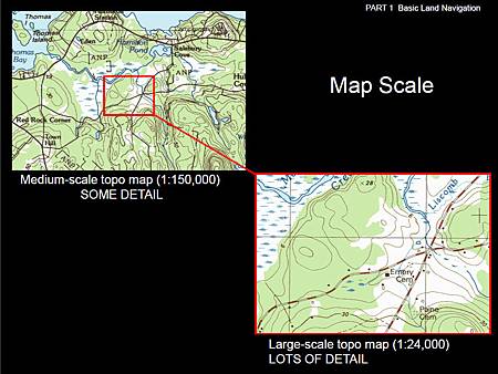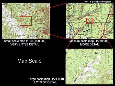 (3)大比例:具有1:75,000更大比例尺的地圖是用於戰術,行政和後勤規劃。這些都是你作為一個士兵或低級別的指揮官最有可能遇到的地圖。標準大比例尺的地圖是1:50,000;然而,許多地區已被映射比例為1:25,000(1英寸= 2,000英尺)。很多細節上顯示此類型的映射