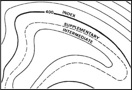 一個等高線表示在地面上的假想線,高於或低於海平面。在等高線上的所有點都處於同一高度。以等高線表示的高度高於或低於海平面的垂直距離。是在一個標準的地形圖中使用的3種類型的等高線,如下所示: