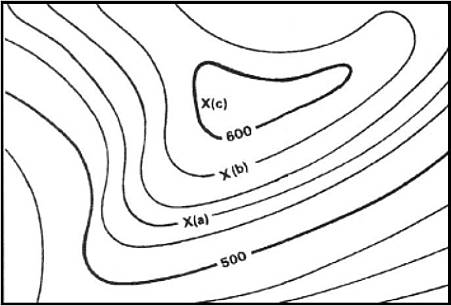 c.確定高度數值是從低海拔高度到高海拔高度。在圖上(a)點在指標等高線之間,較低的指標等高線數值為500,表示該條線內任何點為平均海平面500公尺以上高度。較高的指標等高線數值為600,從下到上指標等高線顯示高度升高