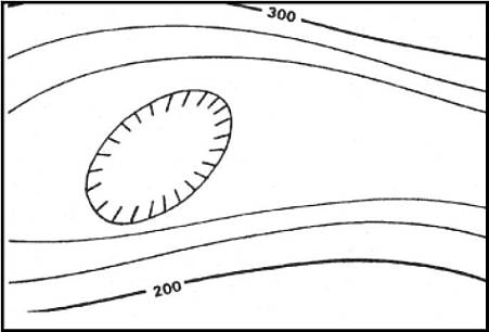 為了估算窪地的底部高度,從窪地之前的最低等高線的數值減一半的等高線間距數值。在圖中,窪地之前最低的等高線是在高度240公尺。因此,高度在窪地的邊緣為240公尺。以確定高度在窪地的底部,減去一半的等高線間距。等高線間距在這個例子中是20公尺。從窪地最低等高線減去10公尺,其結果是,高度在窪地的底部是230公尺。在等高線中一個窪地的刻度標記總是指向較低高度